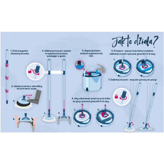 Wiadro wyposażone jest w dwufunkcyjny koszyk umieszczony w dolnej części. Mechanizm obrotowy wprawia mop w szybkie wirowanie, dzięki czemu nadmiar wody trafia do zbiornika.