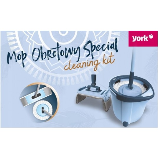 Mop obrotowy York Special z dwiema wymiennymi końcówkami z wiadrem i kijem teleskopowym.