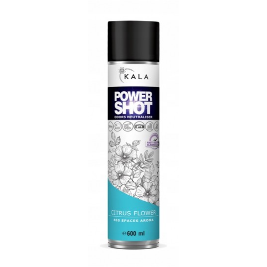 Neutralizator nieprzyjemnych zapachów, odświeżacz Kala POWER SHOT zapach CITRUS FLOWER (600 ml) to zapach, w którego składzie połączyliśmy zapachy kwiatowe oraz cytrusowe. CITRUS FLOWER to bardzo uniwersalny zapach, którego możliwości zastosowania są bardzo szerokie. Z uwagi na obecny w zapachu silny neutralizator, doskonały produkt do WC i toalet.