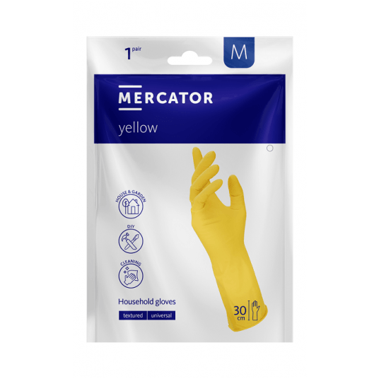 Rękawice gospodarcze MERCATOR yellow posiadają specjalnie teksturowaną powierzchnię chwytną, ułatwiającą wykonywanie pracy w mokrym środowisku, poprawiającą jednocześnie chwytność i kontrolowanie ruchów. Rękawice gospodarcze wykonane są z żółtego lateksu kauczuku naturalnego. Są miękkie i elastyczne, co wpływa na komfort pracy i precyzję ruchów. Dłuższy mankiet rękawic – 300 mm – chroni również przedramiona. Pakowane po 2sztuki w woreczkach foliowych