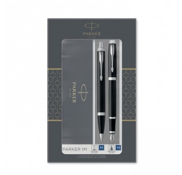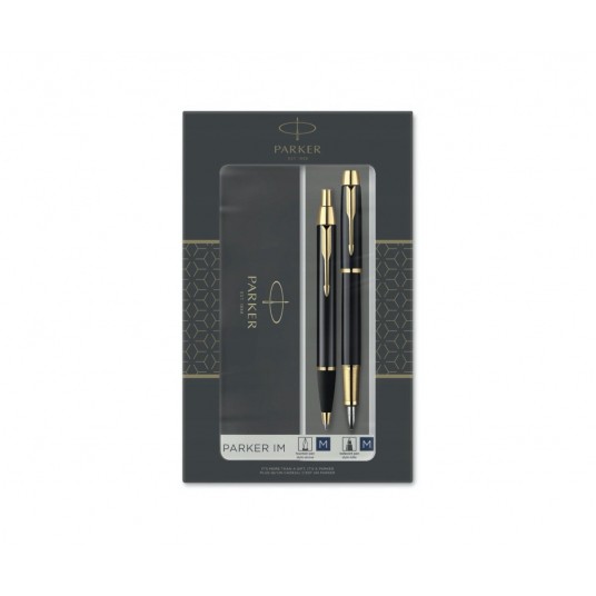 Zestaw składa się z pióra wiecznego Parker IM czarny GT (stalówka M) i długopisu Parker IM czarny GT. Artykuły piśmienne o lakierowanej powierzchni z platerowanymi złotem wykończeniami.