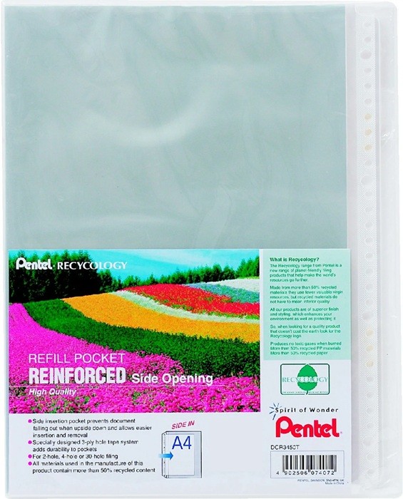 Koszulka na dokumenty posiadająca system bocznego otwierania. 3-warstwowa taśma zwiększa trwałość. Wykonana w ponad 50% z materiałów przetworzonych.